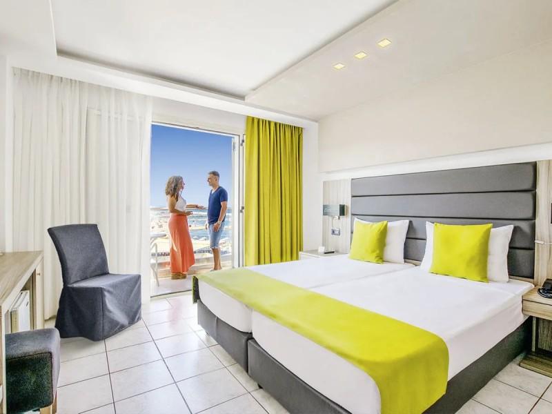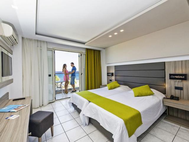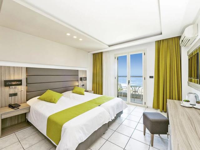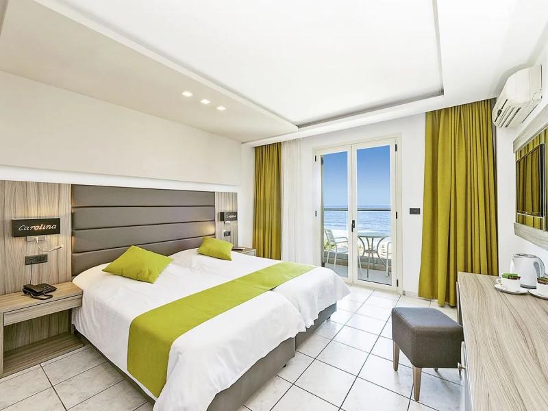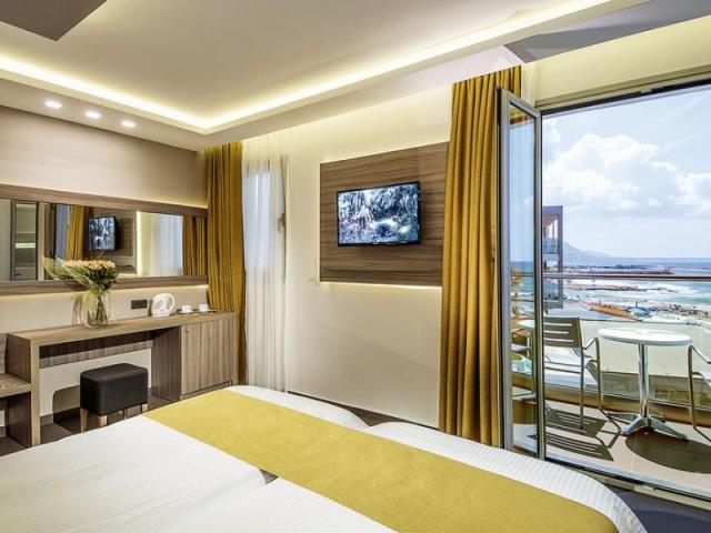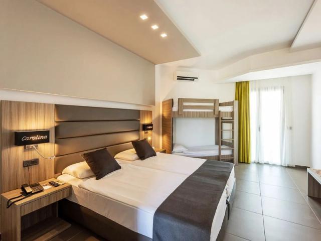 | Dvoulůžkové pokoje s možností jedné přistýlky jsou vybaveny vlastní koupelnou s WC, vysoušečem vlasů, TV-SAT, trezorem (za poplatek), klimatizací, basis Wi-Fi (premium Wi-Fi za poplatek), telefonem a balkonem nebo terasou. Za příplatek možnost pokoj směrem na moře anebo rodinný pokoj až pro 4 osoby. |