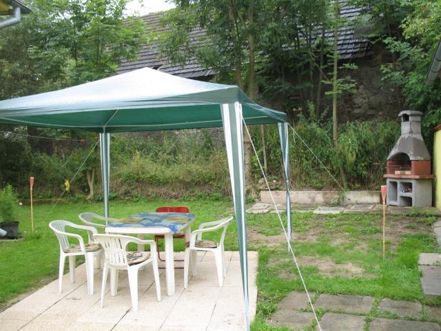 zahradní nábytek plastový, gril zahradní, posezení pod pergolou, slunečník, uzamykatelný prostor pro kola, dětská židlička ano, krb zahradní i v domě (společenská místnost)