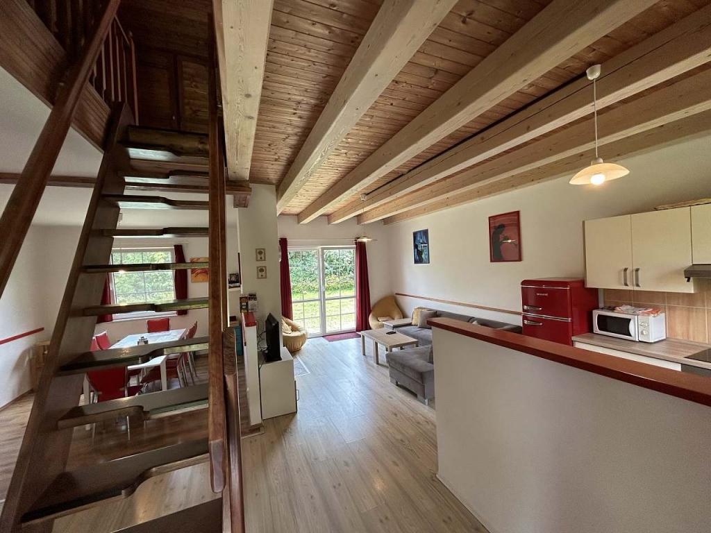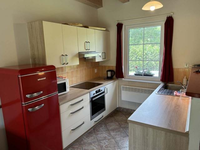 ceně, vaření: sklokeramický sporák s elektrickou troubou, počet plotýnek: 4, typ vytápění: elektrika + tuhá paliva lokální (obsluhuje host), (krbová kamna v obývacím pokoji vytápí spolehlivě celý objekt. přímotopy ve všech místnostech jsou potřebné jen při nízkých zimních teplotách.), Ohřev vody: elektrický bojler (objem: 120 l), domácí zvíře: za poplatek (1 000 Kč, pouze malé plemeno a na vyžádání u majitele objektu.), možnost kouření: ne |