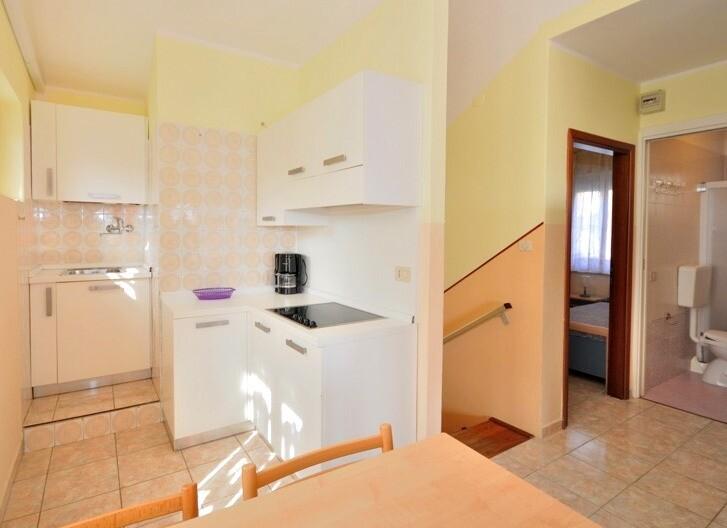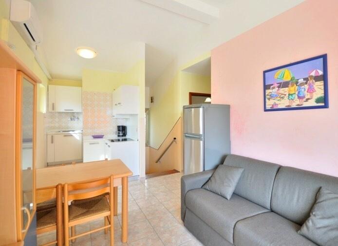 pokoj s gaučem a kuchyňským koutem mezonet, přízemí / 1. patro, vnitřní schodiště, balkon, zahrádka, oplocená, klimatizace, klimatizace v ceně, bez patrových postelí, TV, satelit, lednice, samostatný mrazák, kávovar, sprcha, (sprchový kout), bidet, zahradní nábytek, parkovací místo, nástupní dny v období do 26.06. a od 12.09. kdykoli, 27.06. - 11.09. neděle, min. pobyt v období do 27.06. a od 12.09. min. 5 nocí, 27.06. - 12.09. min. 7 nocí, příjezd od 17:00 do 19,00 dřívější příjezd na vyžádání, za poplatek 30 €, odjezd odjezd sobota od 7:00 do 9:00 ostatní dny od 9:00 do 9:30; pozdější odjezd na vyžádání, za poplatek 30 € apartmán Mary C trilo 6: ložnice s manželskou postelí, ložnice se dvěma lůžky, obývací