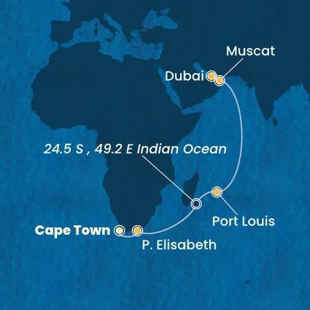 | 1. den,Kapské Město, Jihoafrická republika, (připlutí: | odplutí: 20:00)2. den,Relaxační den na moři3. den,Port Elizabeth, Jihoafrická republika, (připlutí: 07:00 | odplutí: 15:00)4. den,Relaxační den na moři5. den,Relaxační den na moři6. den,Proplouvání Indickým oceánem7. den,Relaxační den na moři8. den,Port Louis, Mauricius, (připlutí: 09:00 | odplutí: 19:00)9. den,Relaxační den na moři10. den,Relaxační den na moři11. den,Relaxační den na moři12. den,Relaxační den na moři13. den,Relaxační den na moři14. den,Relaxační den na moři15. den,Maskat, Omán, (připlutí: 09:00 | odplutí: 18:00)16. den,Relaxační den na moři17. den,Dubaj, Spojené arabské emiráty, (připlutí: 07:00 | odplutí: ) |