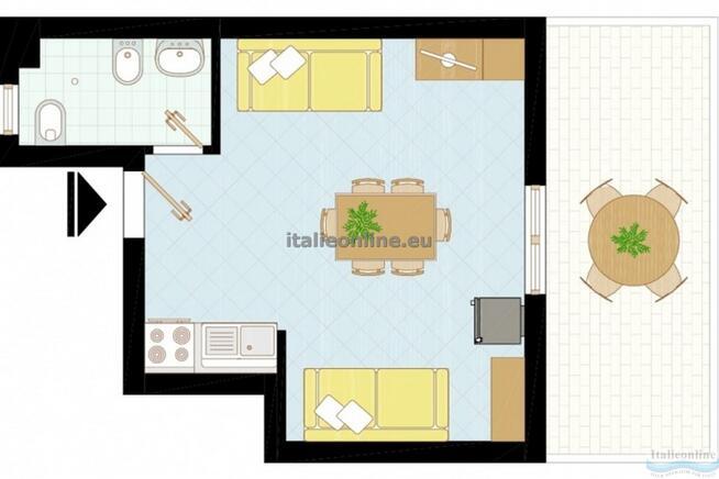 | obývací místnost s kuchyňským koutem, gaučem pro 1-2 osoby (typ šuplík) a gaučem pro jednu osobu, koupelna a prostorný balkon. |