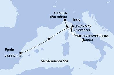 | 1. den,Valencie, Španělsko, (připlutí: --:-- | odplutí: 18:00)2. den,Relaxační den na moři3. den,Livorno, Itálie, (připlutí: 07:00 | odplutí: 20:00)4. den,Civitavecchia, Itálie, (připlutí: 07:00 | odplutí: 19:00)5. den,Janov, Itálie, (připlutí: 09:00 | odplutí: --:--) |